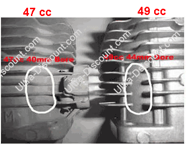 2- Moteur pocket bike 49cc axe de 10 mm ou moteur 49cc axe de 12 mm :Il suffit de démonter le cylindre et de mesurer la taille de l'axe de votre piston. Car en chine certains fabricants installent des cylindres avec des axes de 10 sur certains 49cc et d'autres des axes de 12. 3- Ce qu'il faut savoir :-> un moteur pocket bike 47cc a un piston de 40 mm et un axe de piston de 10 mm, -> un moteur pocket bike 49cc a un piston de 44 mm et un axe de piston de 12 mm ou de 10 mm, -> les kits de transformation 47cc en 49cc (aussi appelés "Big Bore Kit") ont un piston de 44mm avec un axe de 10 mm. |